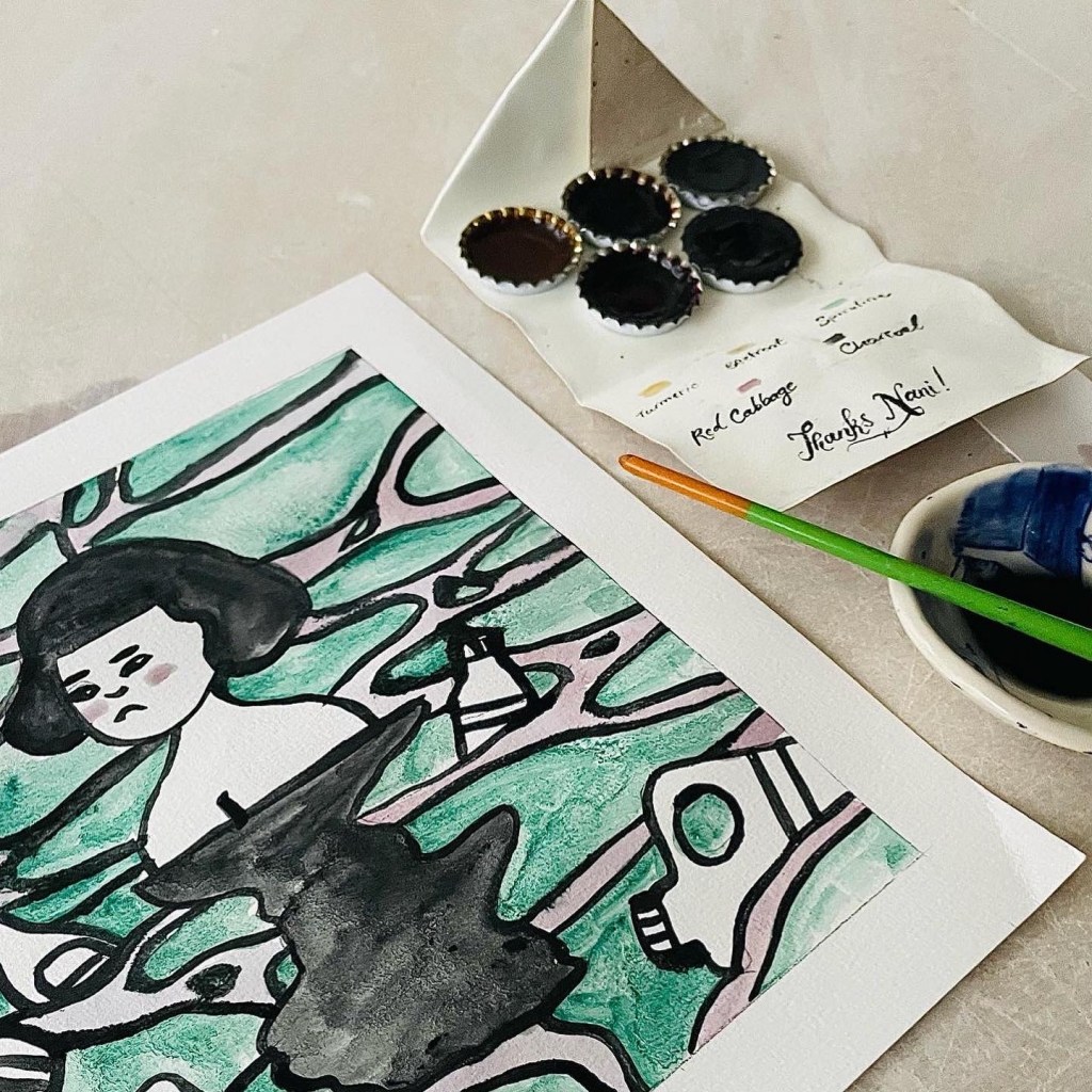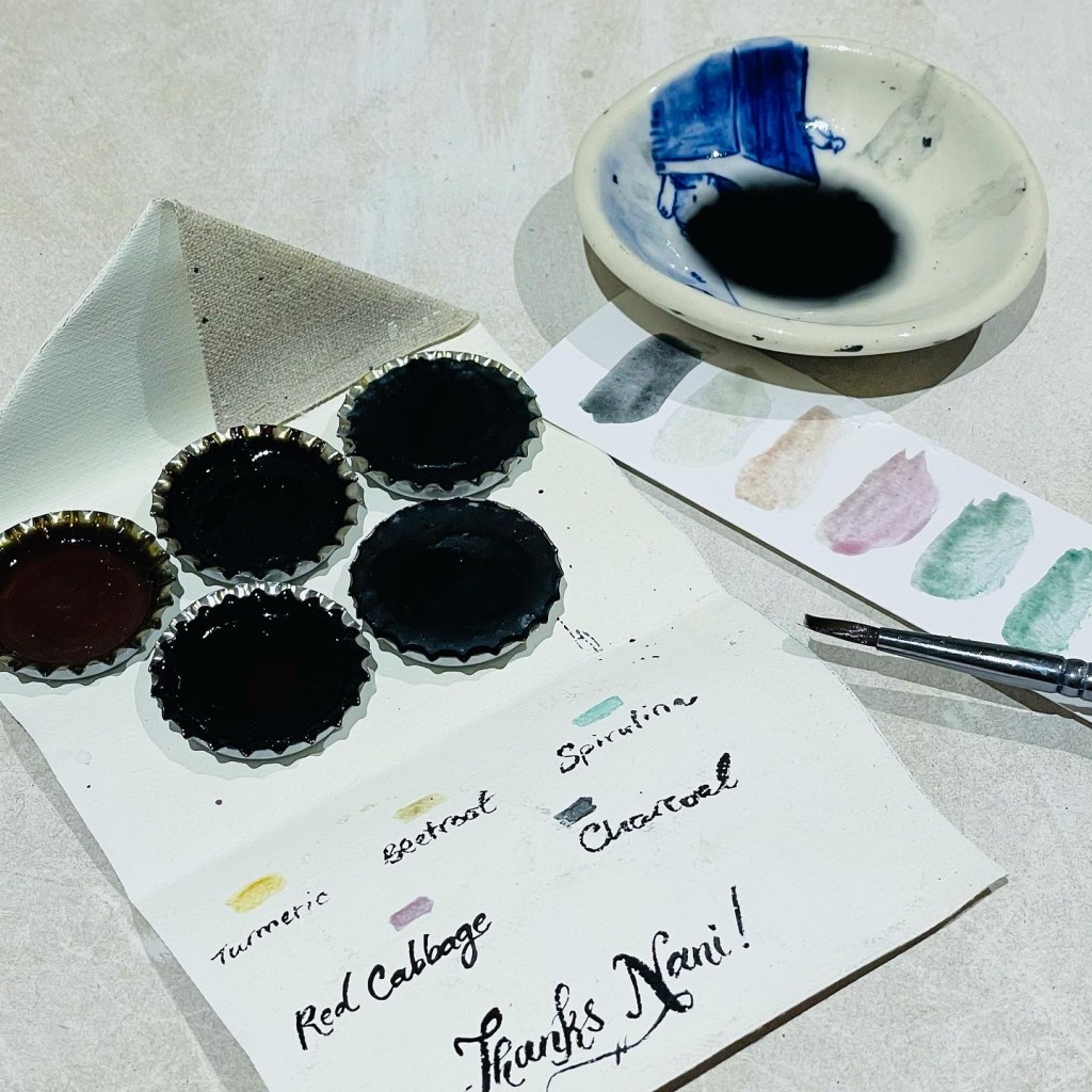 These natural, non-toxic paints are similar to watercolour and easy to use. The pigment from raw materials is quite playful and inconsistent during layering but resulting an interesting flow of colour while mixing with water. I’m also impressed by the volume of paint I can use from such a small tin. Seeing these paints on recycled metal bottle caps made me evaluate how many plastic bottles of acrylic paint I use for a single big canvas painting. Knowing about these types of colours taught me to become more aware of the environmental impact that my everyday practices can have.